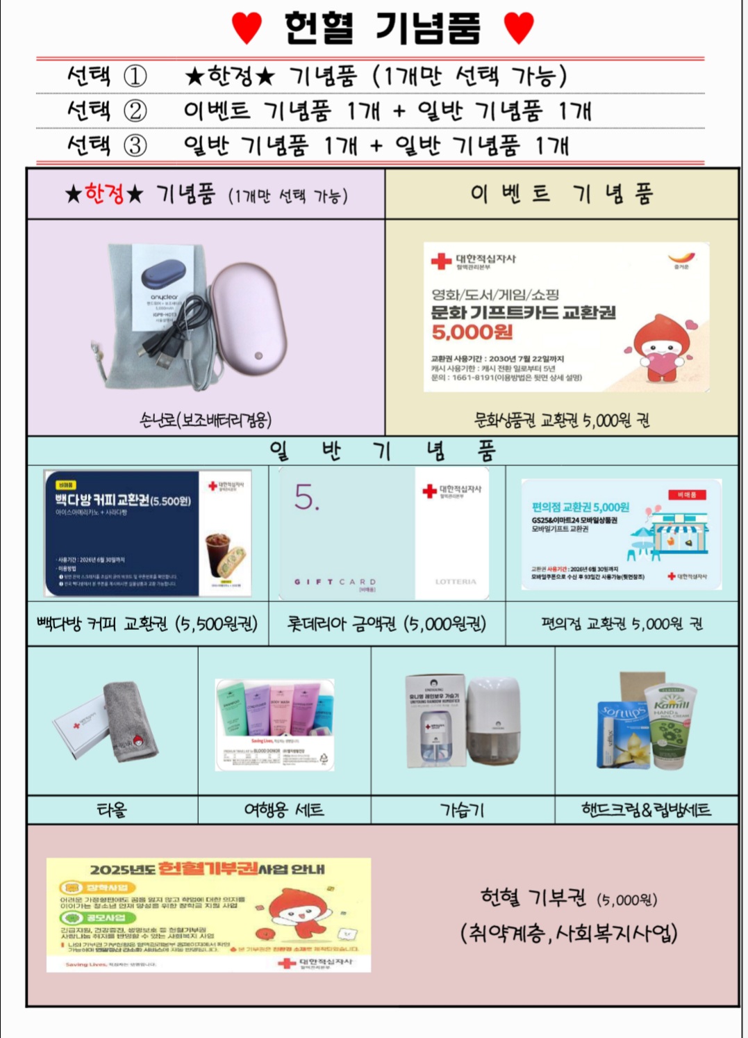 - 헌혈 당일 혈액원 기념품 및 협의회에서 준비한 기념품(비누 등) 증정 예정
